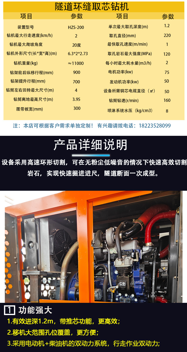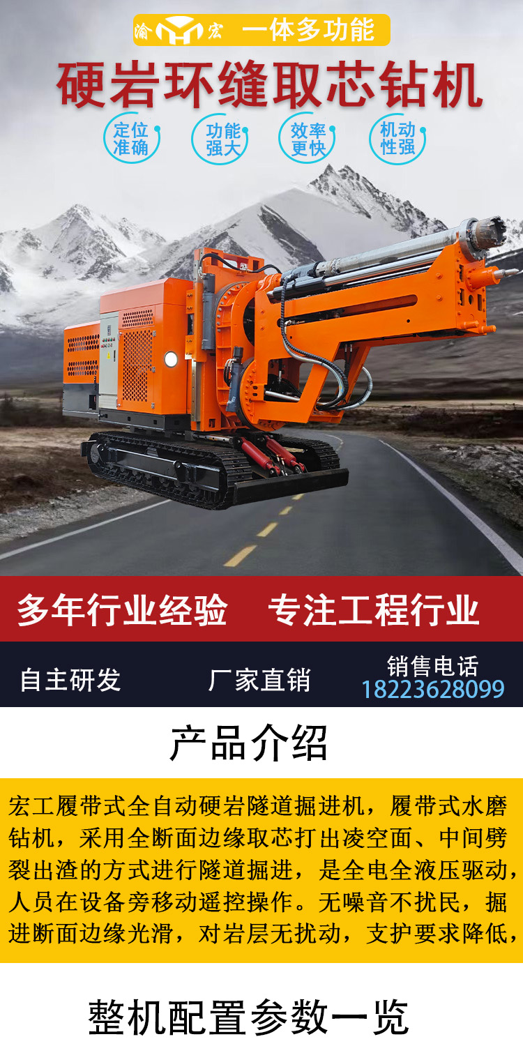 宏工全自动硬岩隧道掘进机、履带式水磨钻机,采用全断面边缘取芯打出凌空面、中间劈裂、大块出渣的方式进行隧道掘进,是全电全液压驱动,人员在设备旁移动遥控操作的一种隧道掘进设备。